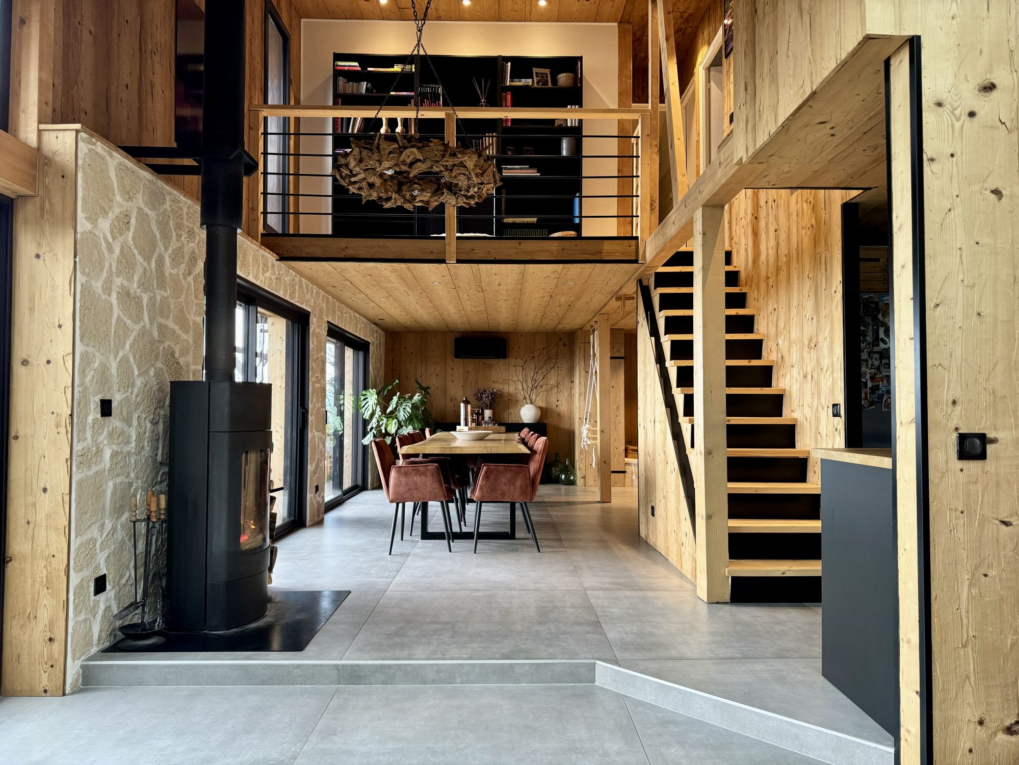 Le chauffage se fait grâce à un poêle bois trônant au milieu du salon cathédrale, permettant ainsi de chauffer l’entièreté des deux niveaux principaux.