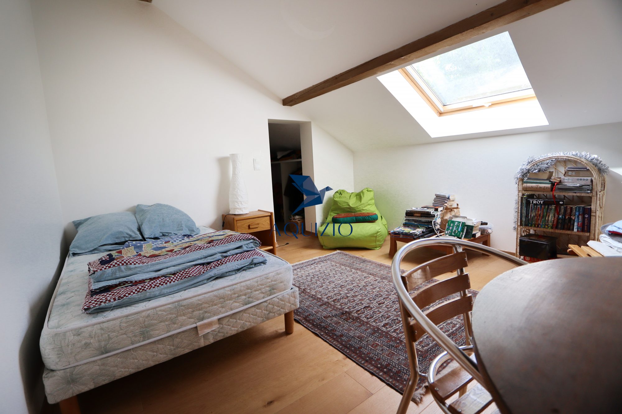 Le 2ème étage, une grande pièce ouverte avec une belle ferme de charpente apparente, ainsi qu’un WC avec point d’eau et deux chambres dont une avec un coin dressing.